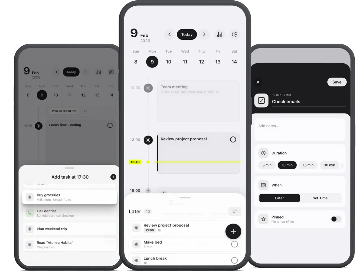 See your whole day on a timeline. Organize tasks and schedule at your own pace. Simple enough to stick with.